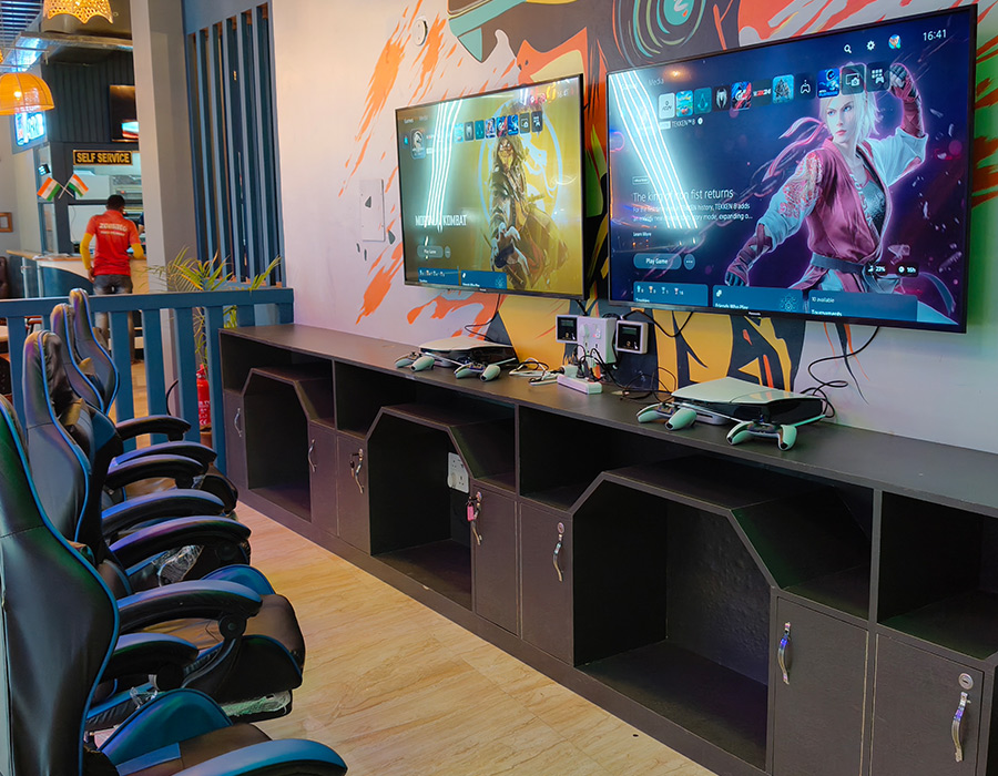 Relax and refuel at Starkidz Game Zone’s dine-in area, offering delicious meals, refreshing beverages, and a comfortable atmosphere for families and friends.
